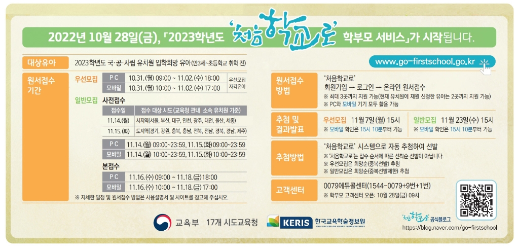 2023 처음학교로 어플을 이용하면 편합니다. 처음학교로라는 시스템을 실시하여 보호자가 장소나 시간에 상관없이 온라인으로 쉽고 간편하게 유치원에 대한 정보를 알 수 있도록 하고 입학 지원 및 자동추첨을 통한 공정한 선발이 될 수 있도록 하였습니다.